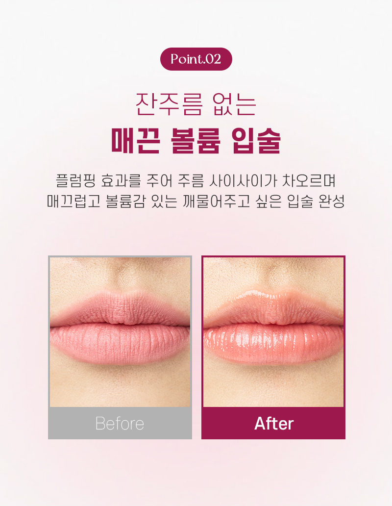 입술 주름과 각질은 잠재우고 볼륨감은 살려, 더욱 도톰하고 입체적인 립을 완성해줍니다.
