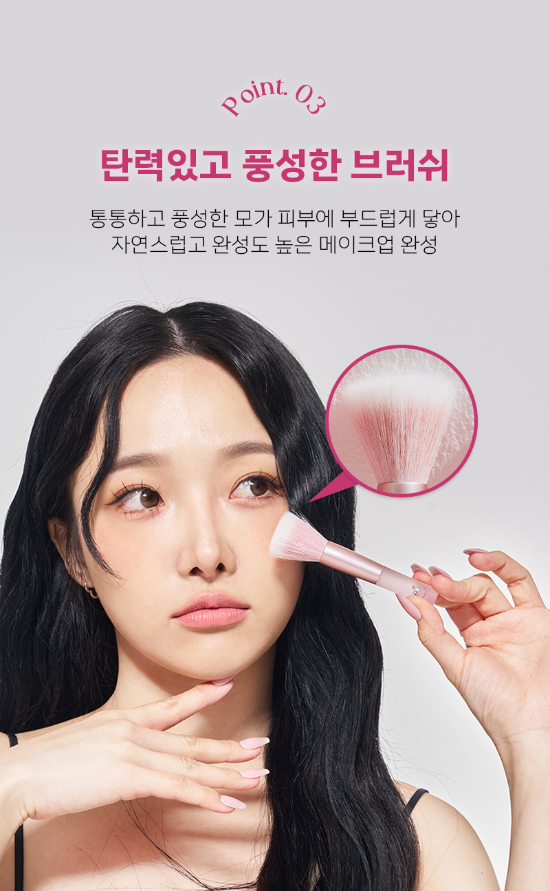 풍성하고 부드러운 브러쉬가 자연스럽게 밀착되어 메이크업이 오래가며 자연스럽고 균일한 발색을 도와줍니다.